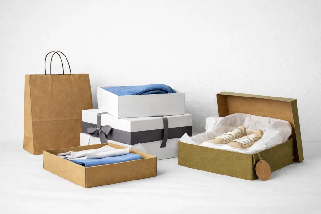 În industria textilă oferim soluții complete de ambalare, inclusiv cutii din carton pentru haine și încălțăminte, pungi pentru retail, precum și ambalaje personalizate adaptate identității brandului, asigurând atât protecția produselor, cât și o prezentare profesională către clientul final.